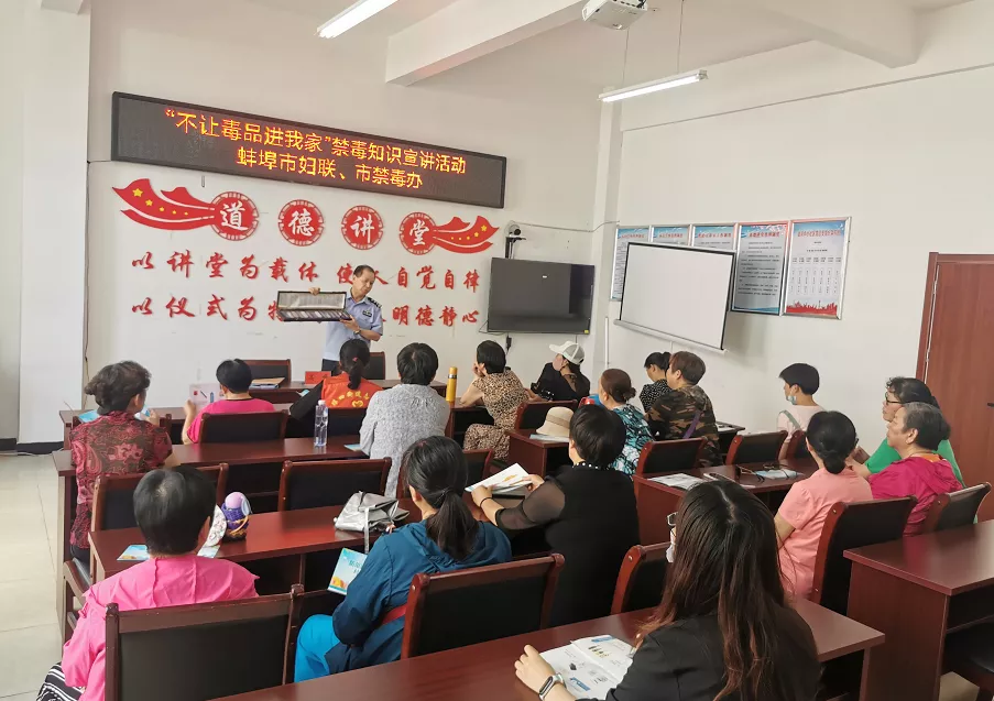 為迎接第35個(gè)國(guó)際禁毒日的到來(lái),進(jìn)一步增強(qiáng)城市居民識(shí)毒、拒毒、防毒意識(shí)與能力,6月16日下午,蚌埠市婦聯(lián)邀請(qǐng)市公安局禁毒支隊(duì)大隊(duì)長(zhǎng)、一級(jí)警長(zhǎng)高峰深入禹會(huì)區(qū)緯四街道銀河社區(qū)開展“不讓毒品進(jìn)我家”禁毒宣傳知識(shí)專題講座。